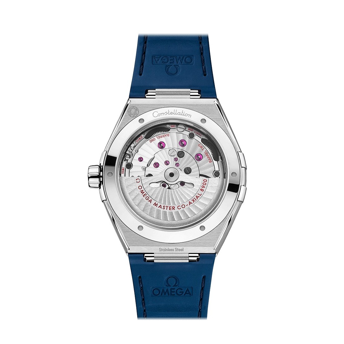 Dieses 41 mm große Modell aus Edelstahl verfügt über eine mit römischen Ziffern aus LiquidmetalT versehene, polierte blaue Keramiklünette, ein blaues Zifferblatt mit Sonnenschliff und ein Datumsfenster bei 6 Uhr. Die Zeiger, das OMEGA Logo, der Constellation-Stern und die facettierten Indizes sind allesamt rhodiniert.