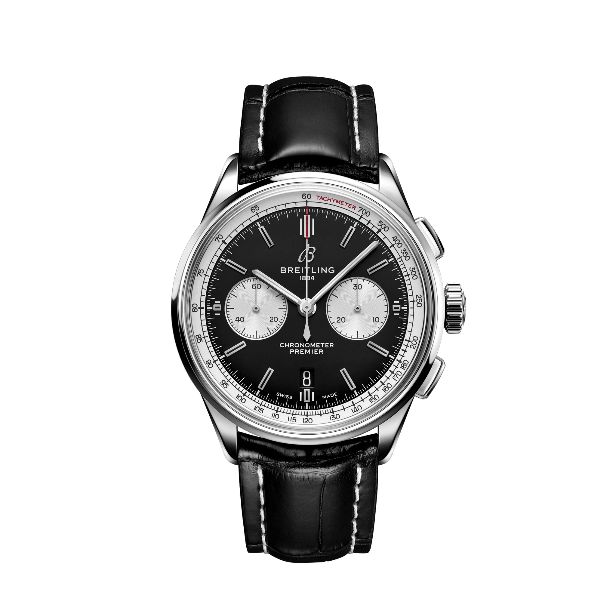 Die Premier überzeugt nicht nur durch rechteckige Chronographendrücker sowie den Panda-Look eines Bicompax-Chronographen, sondern auch durch zahlreiche elegante Designdetails wie Nuten an der Gehäuseseite oder einen transparenten Saphirboden. Dieser Premier B01 Chronograph 42 im Bicompax-Stil wird mit einem schwarzen Zifferblatt kombiniert.